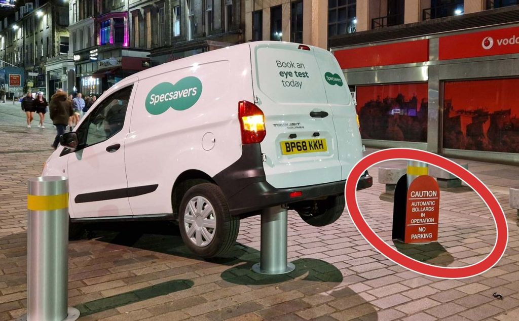 En förare hos optikerkedjan Specsavers åkte på en dundertappe i helgen. Han fastnade på en automatisk trafikpollare på shoppinggatan Princess Street i Edinburgh, Storbritannien.